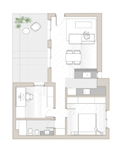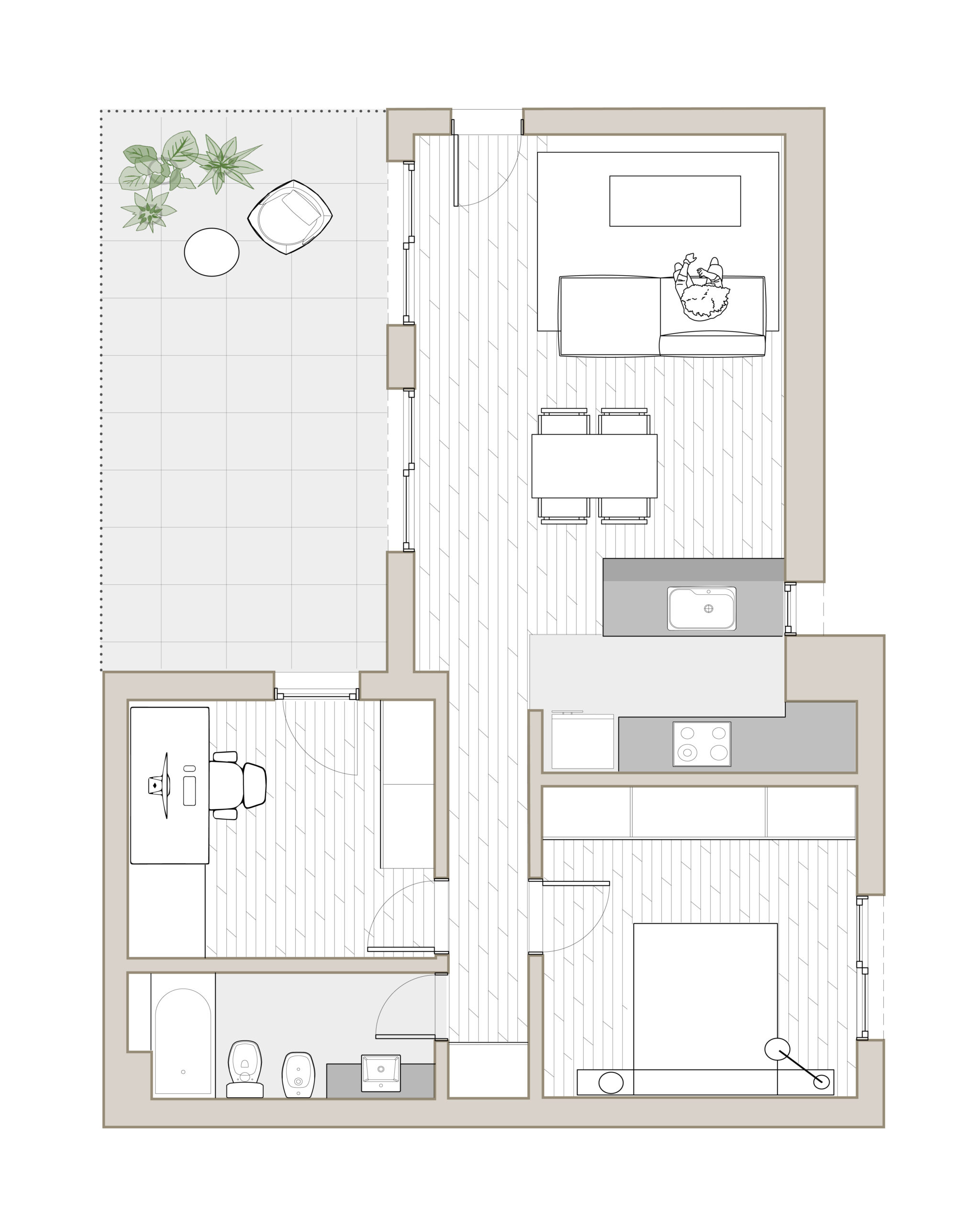 - *Flexibilidad funcional: posibilidad de tener espacio amplio de living-comedor o agregar 2°dormitorio o área de escritorio con cerramientos corredizos
